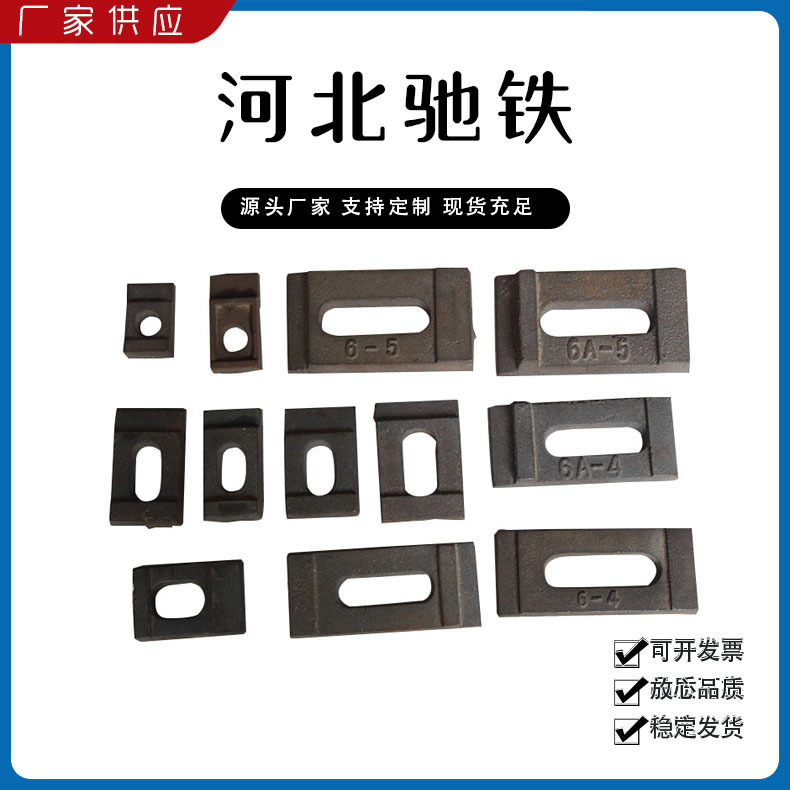 主要產(chǎn)品:鐵路配件、行車(chē)配件、工礦配件、魚(yú)尾板、道釘、壓軌器、軌道壓板、軌距拉桿、護(hù)軌扣板、T型螺栓、魚(yú)尾螺栓、彈條、軌距擋板